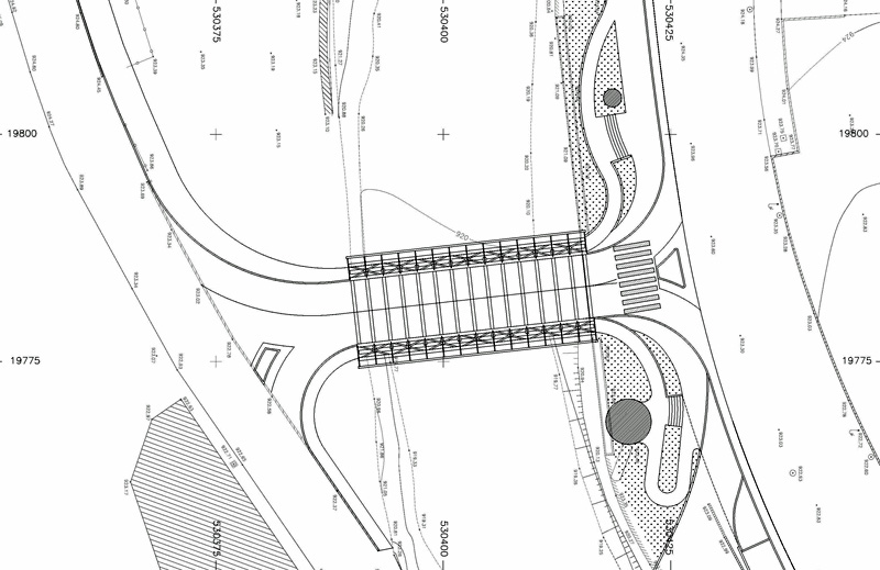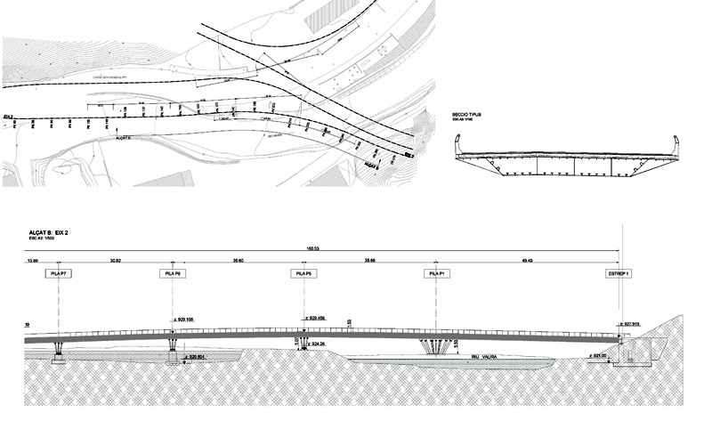 Estructura: piles de tubs d'acer, tauler amb caixó d'acer i llosa col·laborant de formigó armat, pont d'estructura metàl·lica