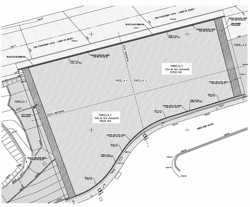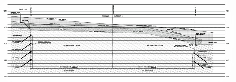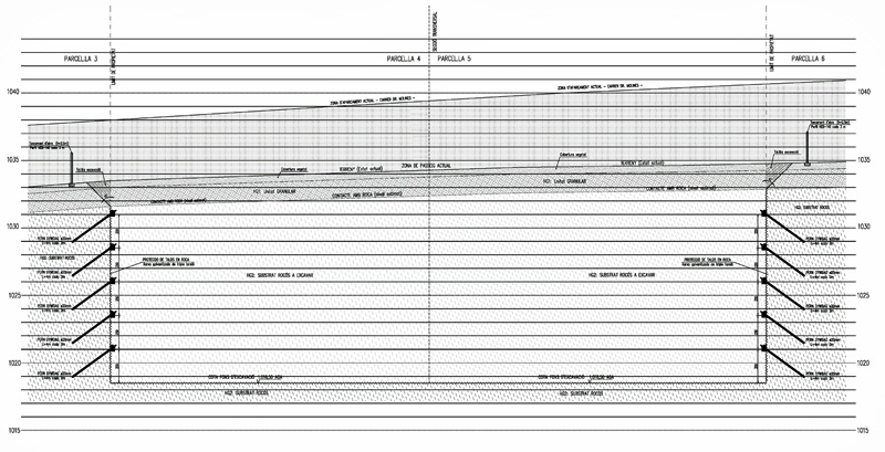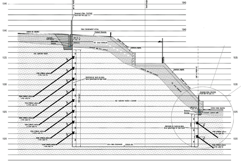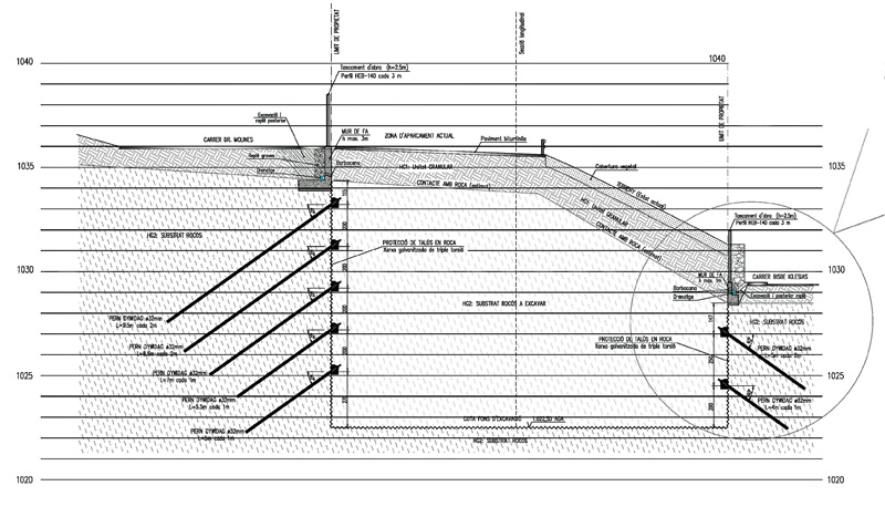 Sosteniment: perns passius en roca, formigó projectat, mur ancorat de formigó en terres
