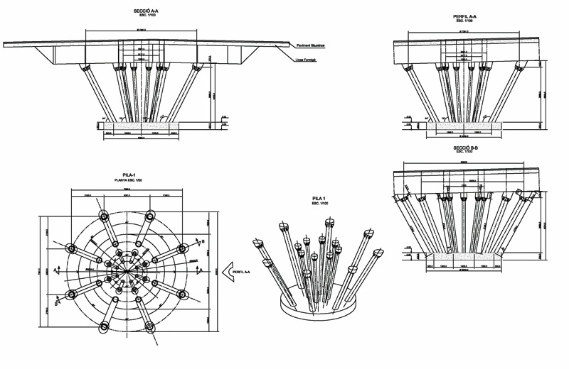 Estructura: piles de tubos de acero, tablero con cajón de acero y losa colaborante de hormigón armado, puente de estructura metálica